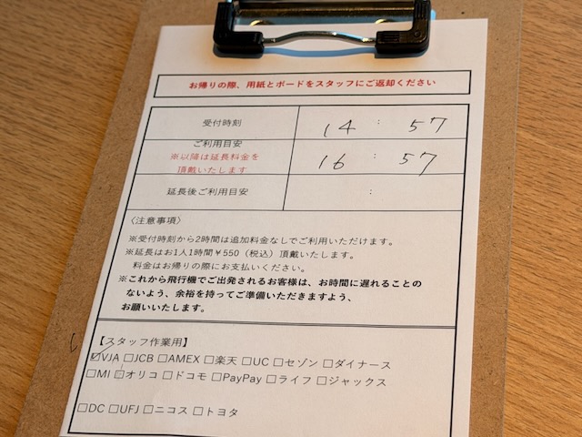 受付時に、利用可能時間の記入されたものを渡されるので、これを退室時に返却するシステムでした。