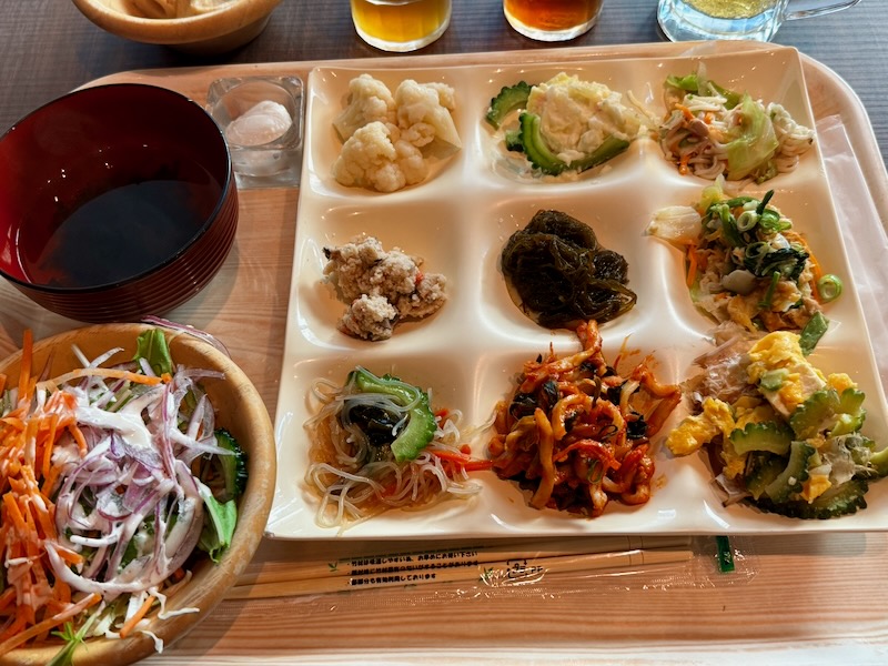 ゴーヤチャンプルー定食」+「ピリ辛ゴーヤ」+「オリオンビール」をいただきました。