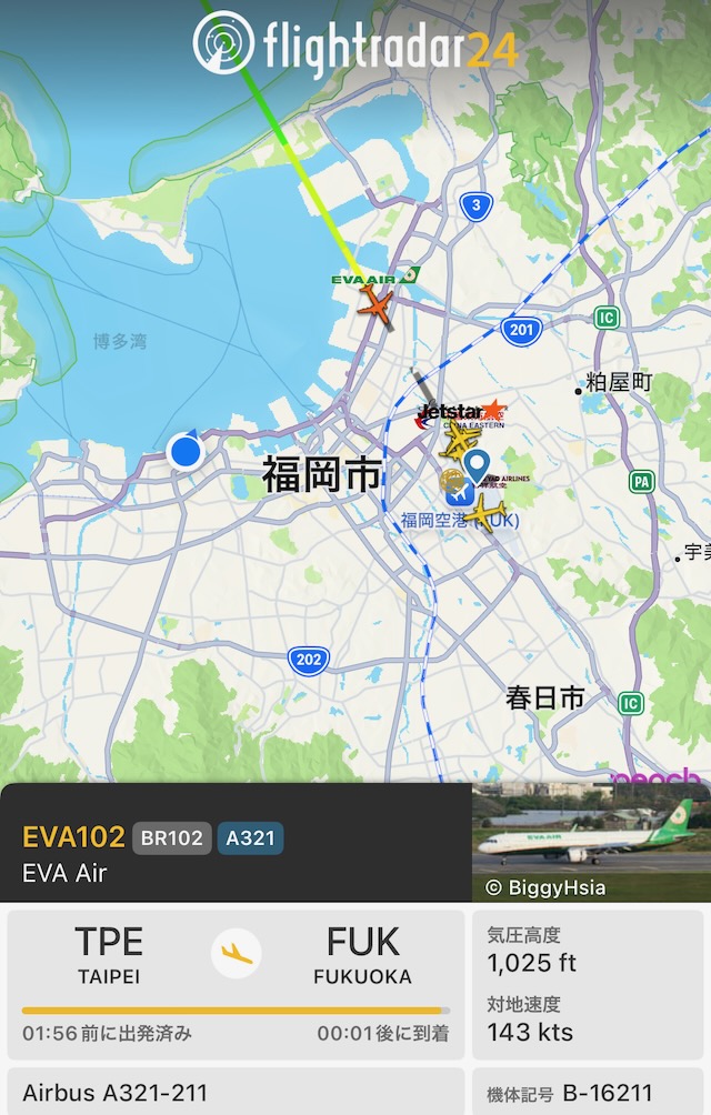 ここからは、福岡空港に着陸する飛行機を見ることが出来るので、「フライトレーダー」を見ながら、着陸に向かう飛行機を眺めて過ごしました。