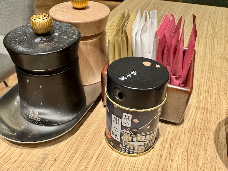 テーブルに置かれていた調味料に「京の黒七味」がありましたが、口?が開いたままでした^^;