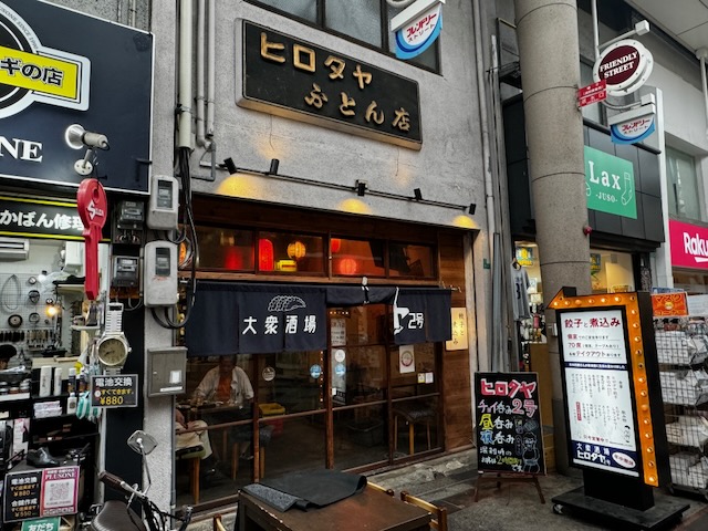 「ヒロタヤふとん店」の看板が付いてるので、もともとは布団屋さんだったのかな?という大衆酒場です。十三駅スグの商店街にあって、昼から通し営業をされているので、使いやすかったり♪看板によると「餃子と煮込み」がウリのようだし、餃子好きとしては気になるお店でした。定食もあるようですが、それよりも、お酒とアテ目当てで行っちゃいます。