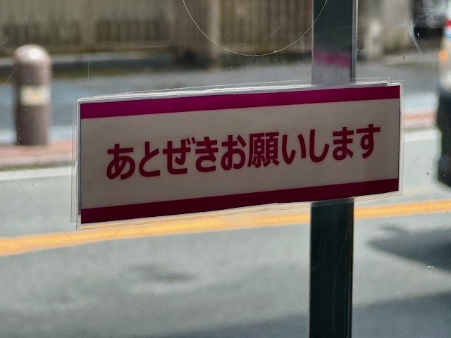 「あとぜきお願いします」ですが、熊本の方言で、「開けたドアや戸は閉めてくださいね」という意味のようでした。