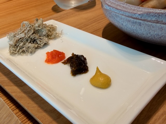 薬味は、カラシ、白エビのり、山うに、白とろろ、の4種類でした。