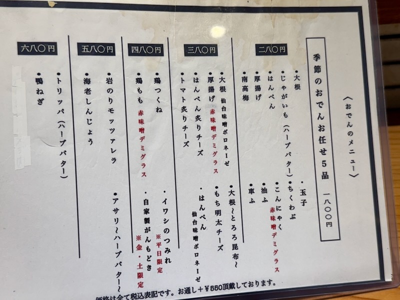 大根、じゃがいも、と普通の品揃えと思いきや、じゃがいもは”ハーブバター”って付いてるし、「はんぺん炙りチーズ」や「岩のりモッツァレラ」とか、ソソられるメニューが並んでました!