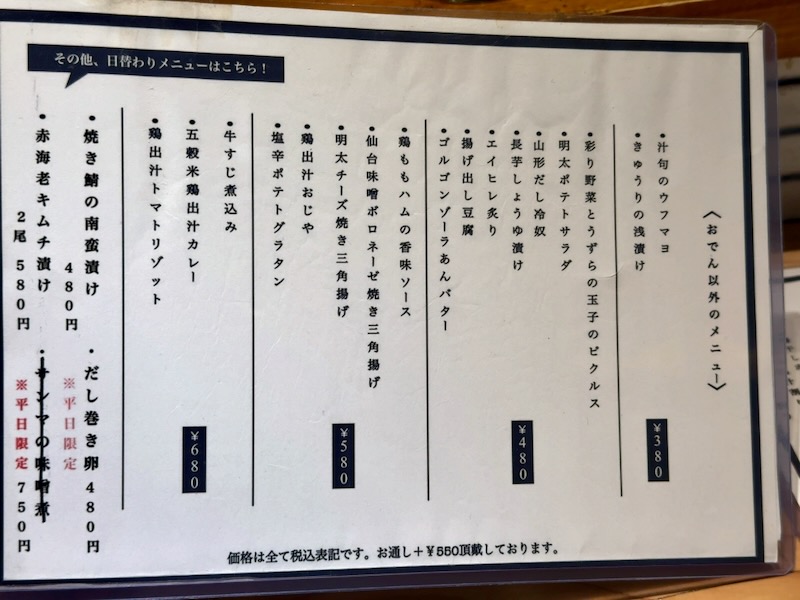 おでんのメニューは面白そうなものばかりでしたが、ハシゴ◯軒目だったので、そんなに食べれなかったのが残念。。