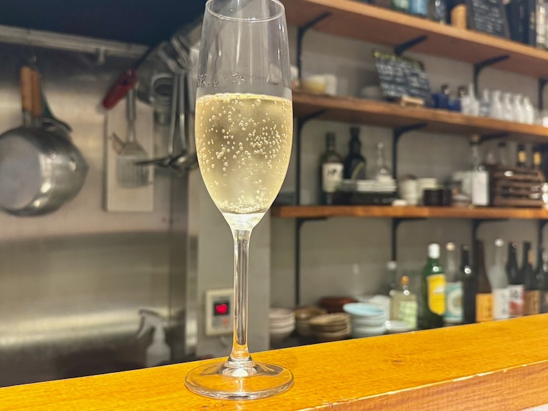 歩き回って喉も乾いてたので、とりあえず炭酸系ということでスパークリングワインをいただきました。