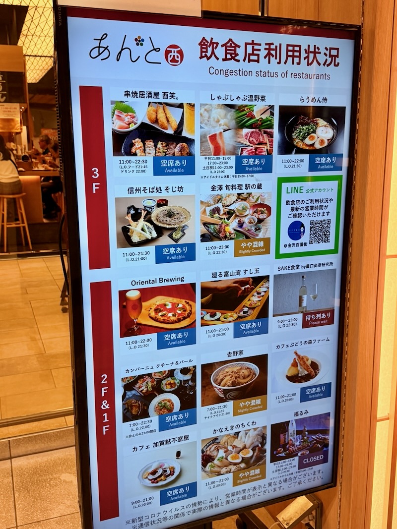 もう一つの「あんと」も同様でしたが、入口のところで、各店舗の空き状況が分かるようになっているのがとても良いと思いました。