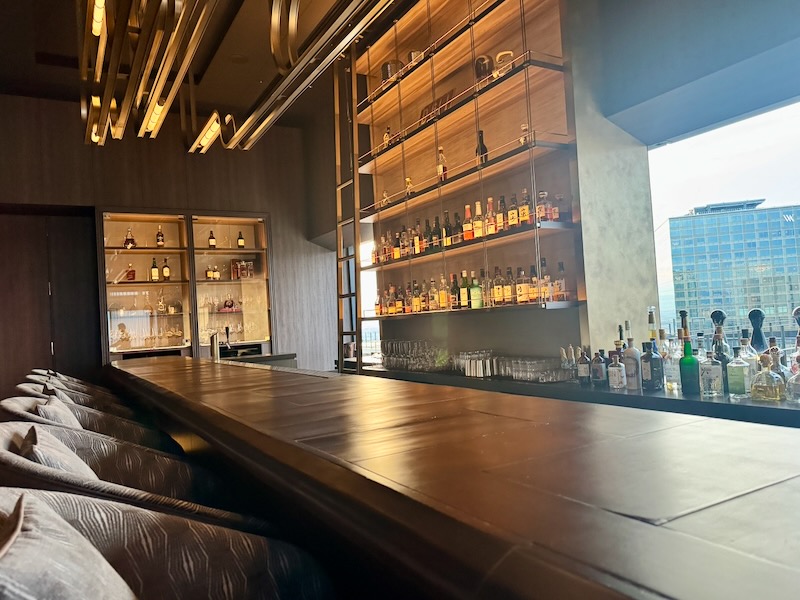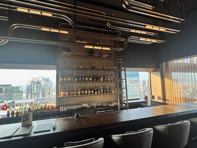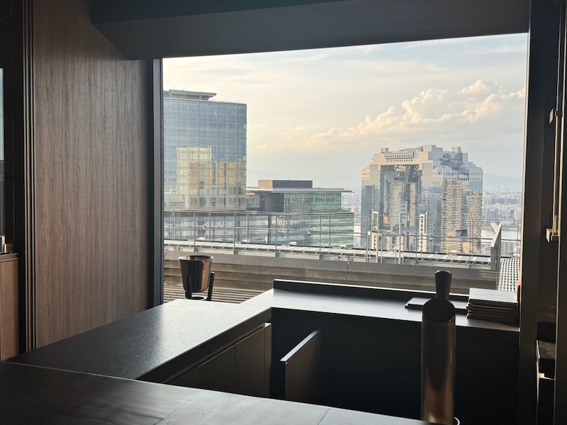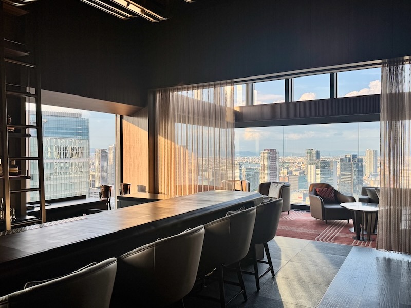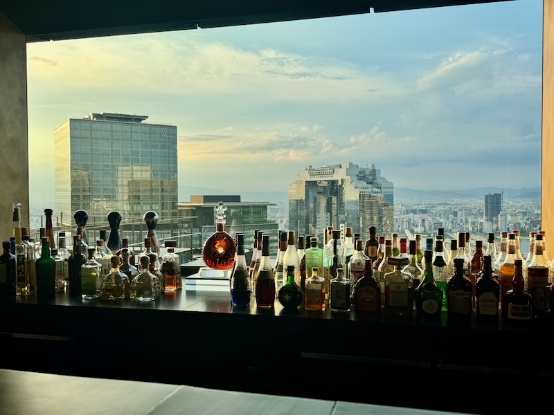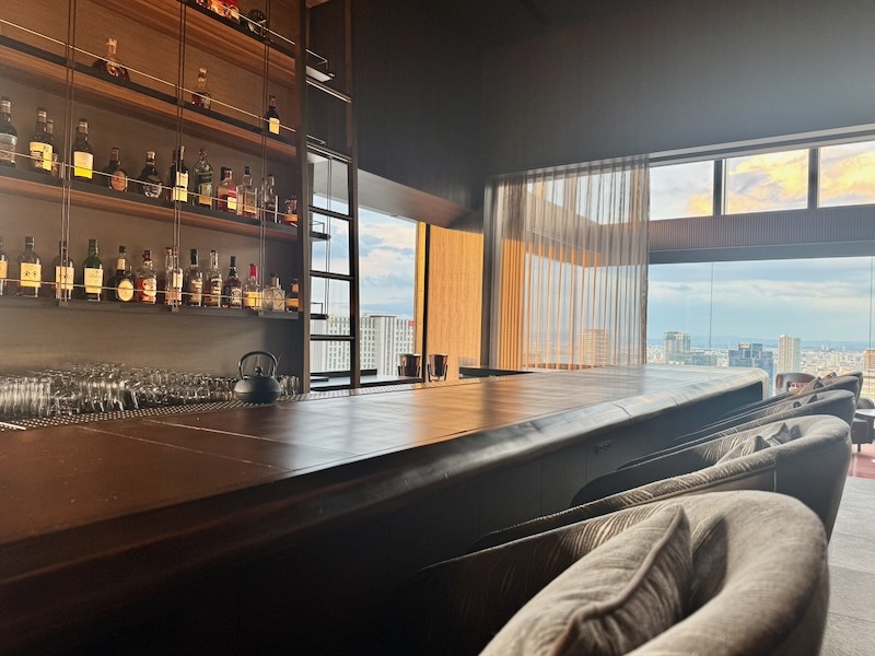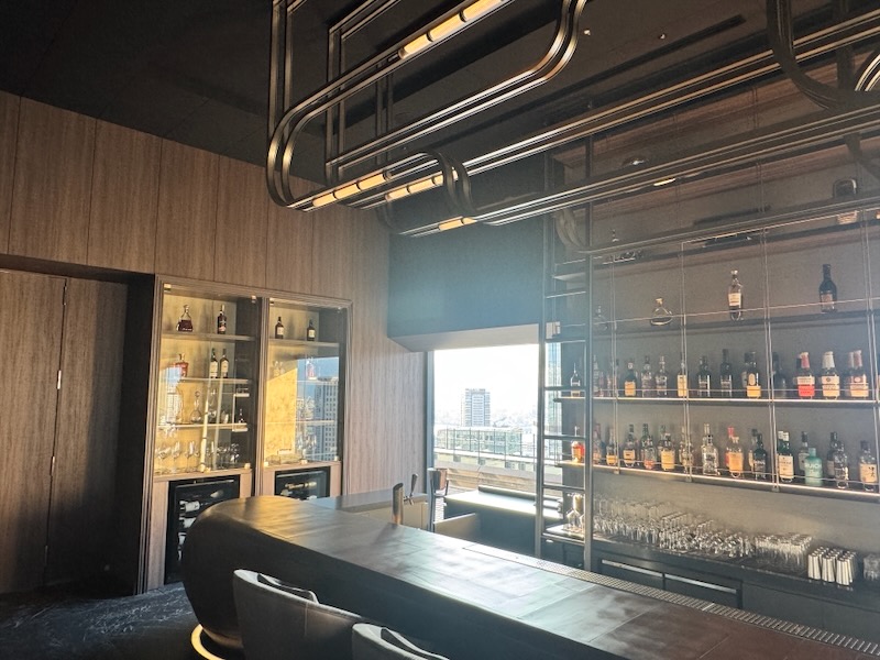 入ると長いバーカウンターがあって、バックバー横の窓からはスカイビル側の景色が見えました。