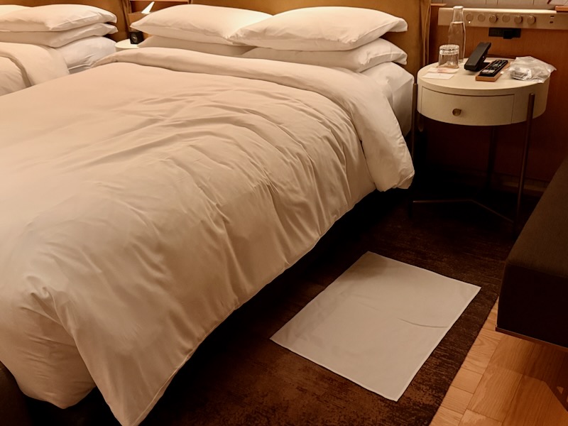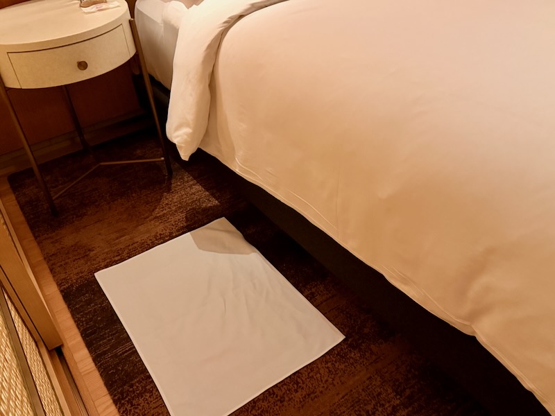 「ターンダウン時に、ベッドから降りる場所(床の上)に敷かれるタオルのような布であれば、このように呼ばれます。これは、裸足で床に触れずに済むようにという配慮から置かれます。」