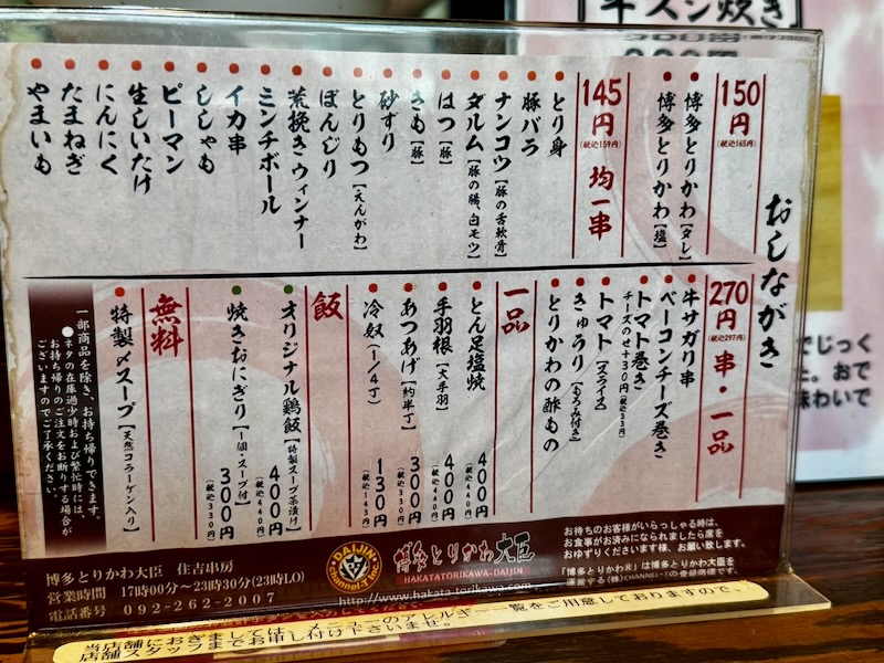 その他串の焼き物のほとんどが、とり皮より5円安い145円均一で、一品物も含めた最高値が400円という設定でした。