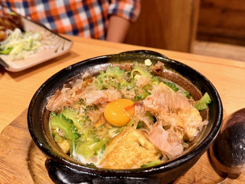 先ずは「ゴーヤチャンプルー」ですが、生卵を自分でかき混ぜていただくスタイルでした!